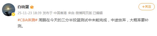 新赛季CBA体测火热进行,根据媒体人白晓篮报道,深圳男篮老将兼主帅周鹏在三分半钟投篮测试中,遗憾未能完成,他选择中途放弃,因而大概率需要参加补测。